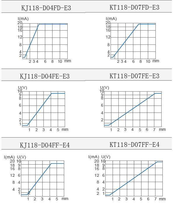 2.各種模擬傳感器標準檢測體接近感應面,在規定的條件下,它們的可使用距離與輸出電流成比例,各曲線詳見備曲線圖。