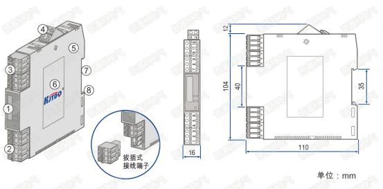 · 采用標準的35mm DIN導軌卡式安裝。可拔插的接線插頭端子,彈簧壓緊連接。